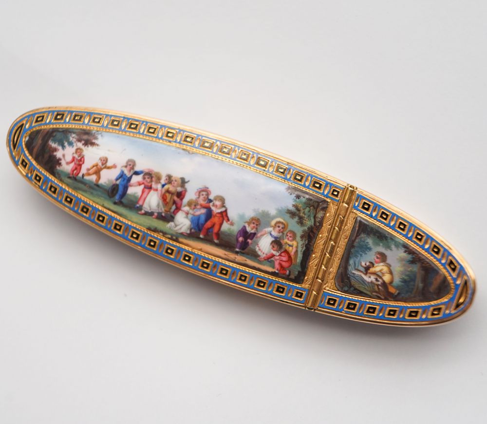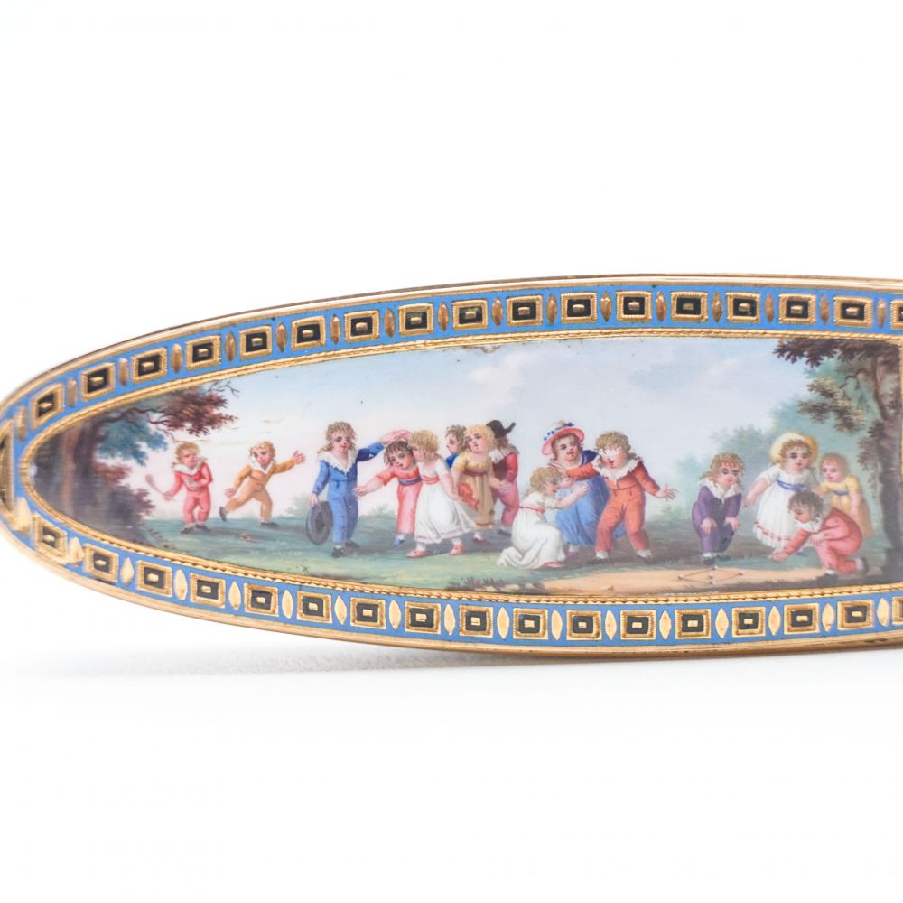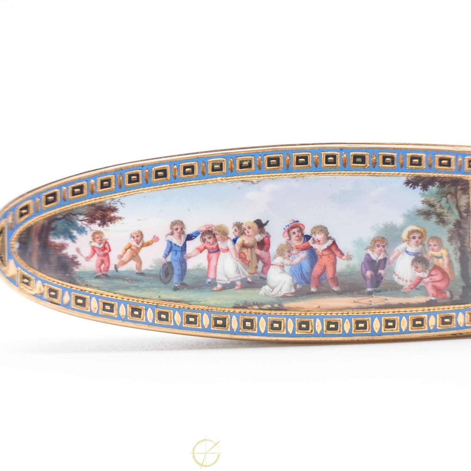 Made in Switzerland circa 1780, 95x26x13mm, gold case inlaid with a watch. Polychrome painted enamel depicting 16 children playing happily and a dog. Former collection of Lord Michael Graham Ruddock Sandberg (1927-2017), Baron Sandberg, who is a very famous collector worldwide.