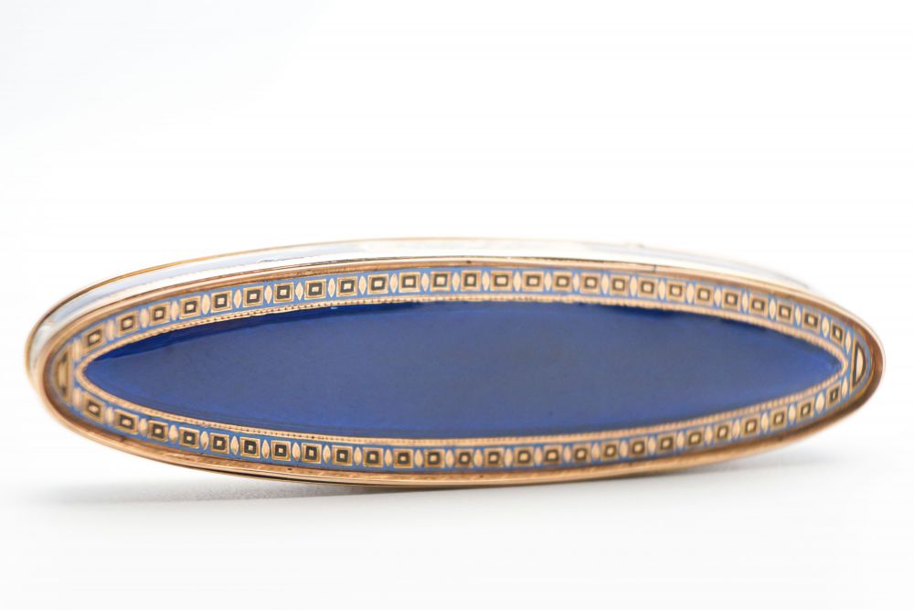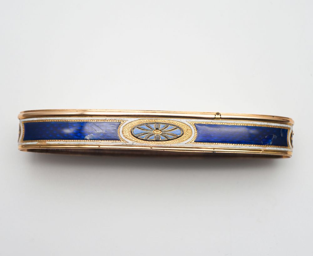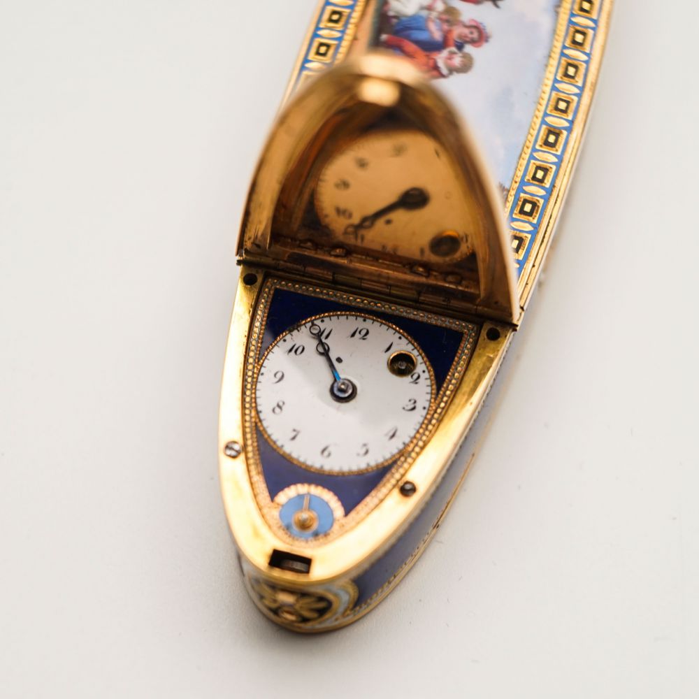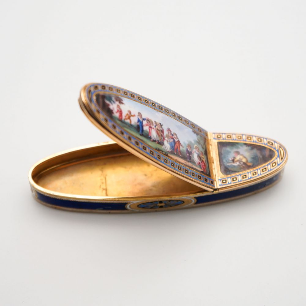 Made in Switzerland circa 1780, 95x26x13mm, gold case inlaid with a watch. Polychrome painted enamel depicting 16 children playing happily and a dog. Former collection of Lord Michael Graham Ruddock Sandberg (1927-2017), Baron Sandberg, who is a very famous collector worldwide.