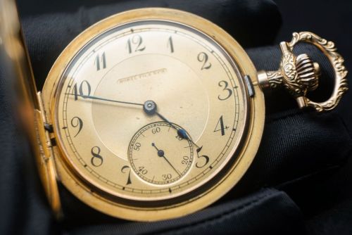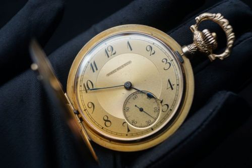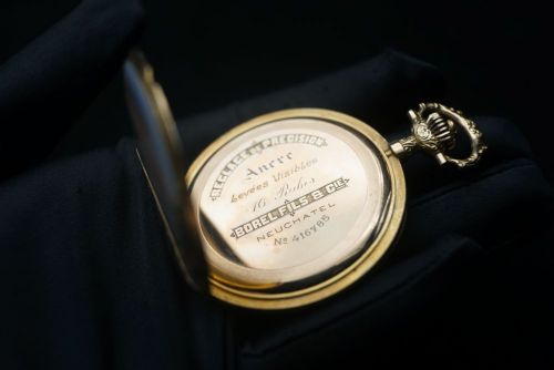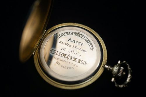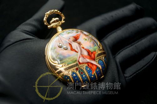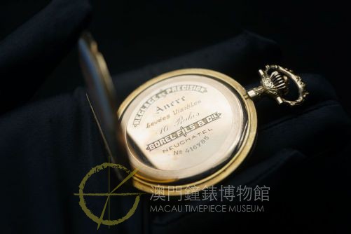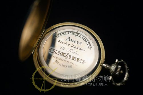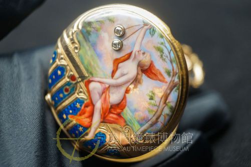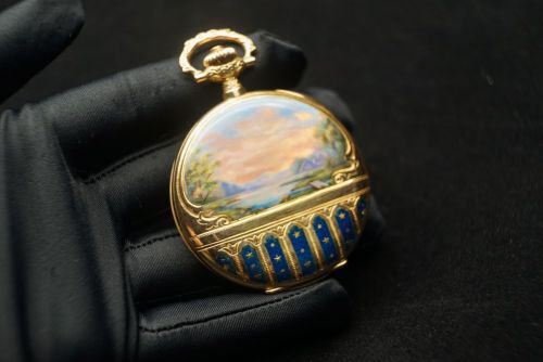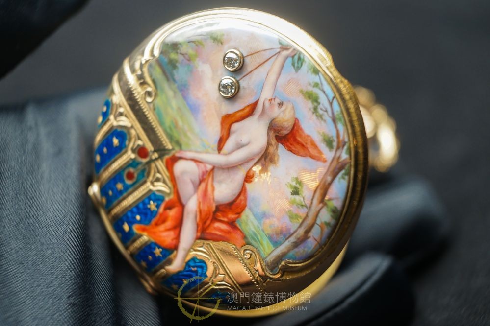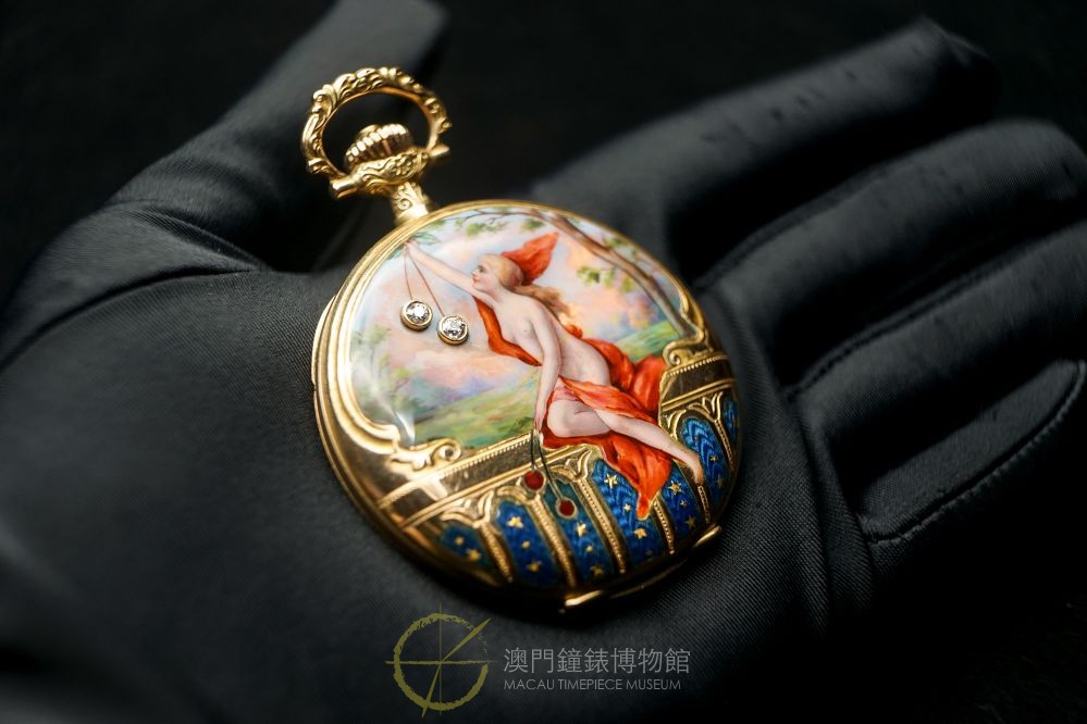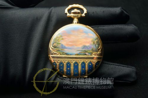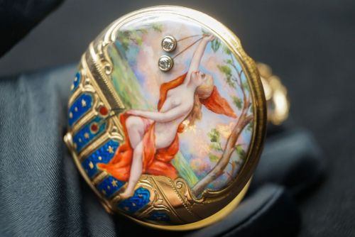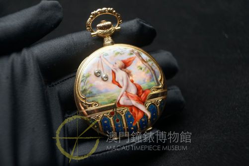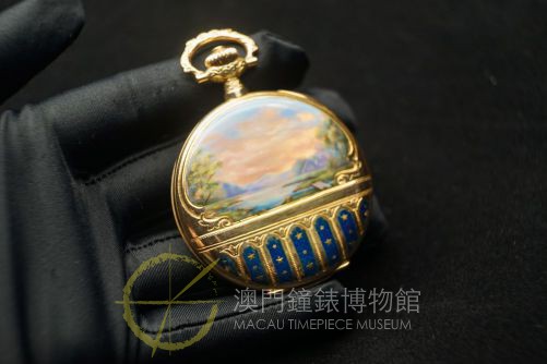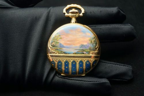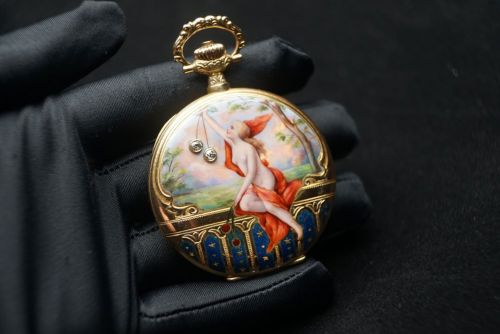 Circa Late 19th Century, 49mm, 14K gold hunter case with enamel and diamond-set, guilloché gilt dial, the front polychrome enamel shows portrait of a maiden in a loggia set within a classical landscape, picking cherries which set with diamonds, the back enamel shows an idyllic landscape, both covers enhanced with blue guilloché with gilt star motif, engraved bow and pendant. Borel Fils &Cie was a renowned watchmaker in Neuchâtel in late 19th century.