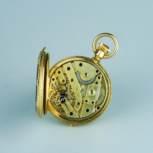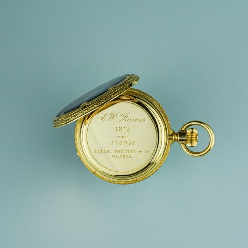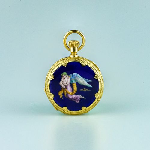 Made in 1872 by Patek Philippe, 41mm, chased 18K gold hunter case, signed and dated on gold cuvette. The lids with finely painted enamel allegories of Night and day after the Danish Neoclassical sculptor Albert Bertel Thorvaldsen (1770-1844). He created the pair of marble reliefs "Night" and "Day" in 1815,and then they became extremely popular as a decorative motif, the designs were reproduced throughout the 19th century.