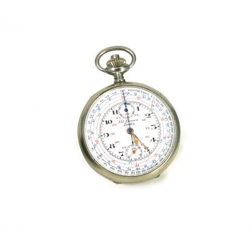 約1950年間製作,表徑51毫米,白銅材質外殼,開面計時懷錶,24小時白色琺瑯盤,簽署“J. W. Benson London” 。具時分和小秒針顯示,測速計及30分鐘計時功能。12點鐘位置為30分鐘計時盤,測速區間為15至300公里/小時。盤面共有四圈時速區間,時速數字由外圈到內遞減,而不同的時速區間以黑、藍、紅、綠四色標示,使用者可根據觀察計時盤上的四色區間來輕鬆判斷計時秒針所指的時速讀數。